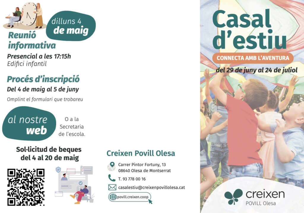 Tenim tot a punt per a l’esperat Casal d’Estiu de l’escola, una proposta educativa i recreativa pensada per a nens i nenes de totes les edats. Si vols que els teus fills passin un estiu ple d’activitats divertides, creatives i enriquidores, no et pots perdre aquesta oportunitat!